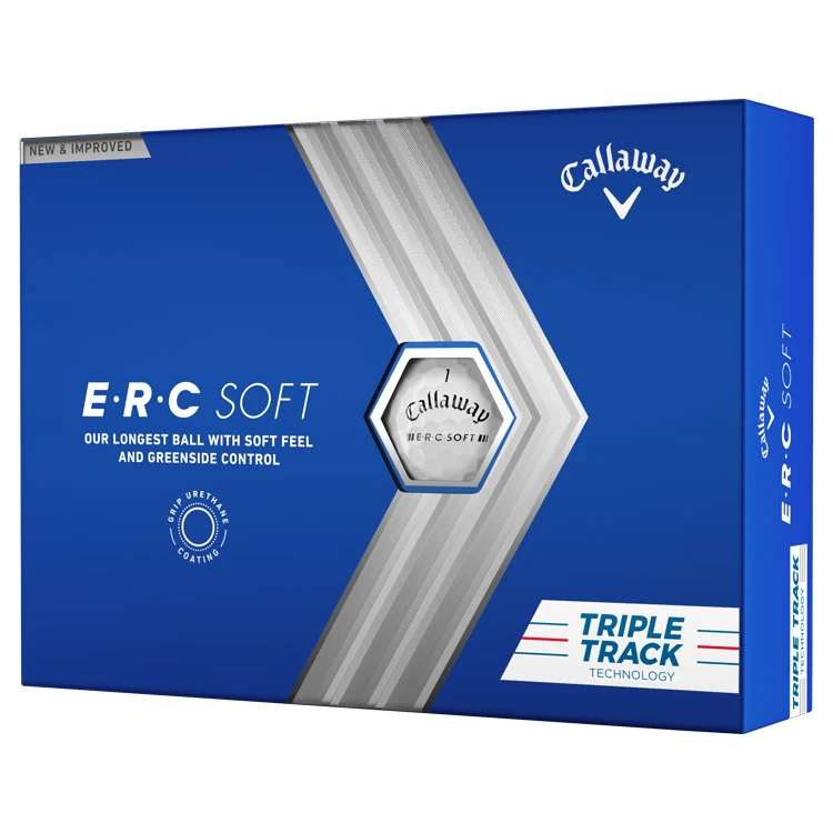 | Callaway ERC Soft Triple Track Golf Balls Longest Distance With Exceptional Soft Feel The Callaway ERC Soft Triple Track Golf Ball is Callaway’s longest golf ball with soft feel, and for 2023 They’ve introduced technologies that promote a new level of complete performance. Leading with the cover, Callaway have created an all-new GRIP Urethane Coating System that provides even more greenside spin. The unique cover is paired with an all-new HyperElastic SoftFast core that increase ball speed, while maintaining soft feel through the bag. These new technologies properly complement each other producing incredible distance with the driver, and added spin for greenside control with your wedges. New GRIP Urethane Coating has been introduce for increased greenside spin, the coating system features high-elongation paint for increased control on approach shots and short game shots. The Hybrid Cover allows Callaway to create a versatile, multi-material construction. This is how they combine maximised distance from high launch and low spin, with soft feel and durability. The New Triple Track Dagger lines are prominently featured on ERC Soft to help you find the right alignment for every putt. |